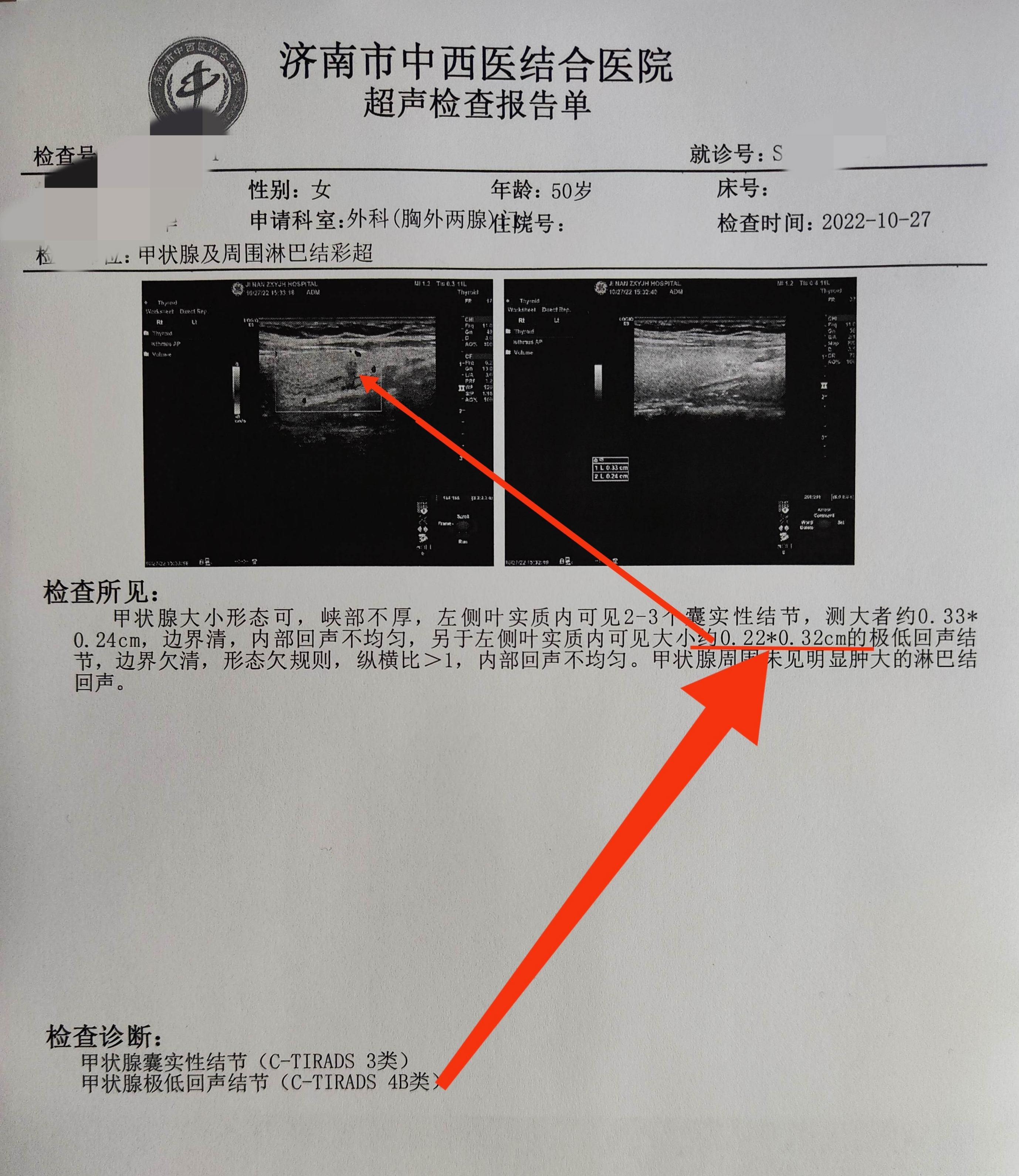 上(shàng)周五,門診一(yī)名女(nǚ)性患者來(lái)診,查體(tǐ)彩超發現(xiàn)甲狀腺結節